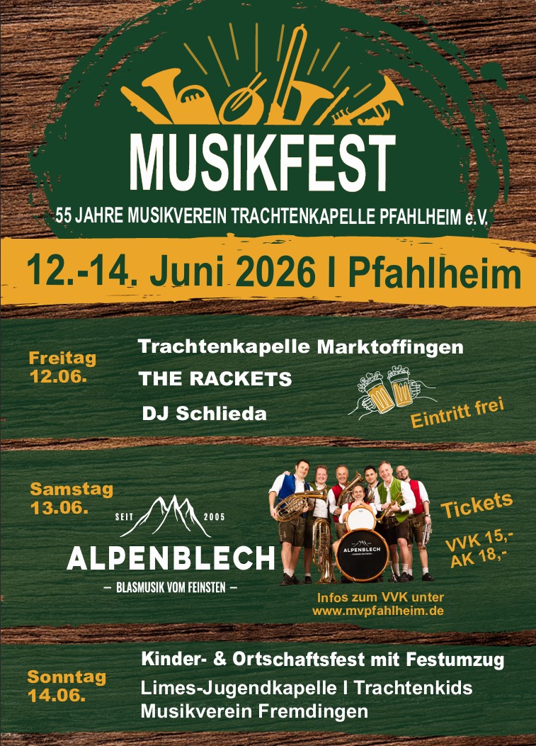 Wir feiern Jubiläum und laden euch herzlich zu unserem großen Festwochenende vom 12.–14.06.2026 auf den Festplatz neben der Kastellhalle in Pfahlheim ein. Freut euch auf drei Tage Musik, Stimmung und Gemeinschaft für Jung und Alt!